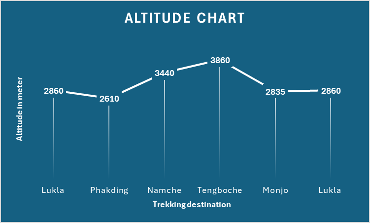 The altitude chart (Figure 1) shows Tengboche as the highest elevation and Phakding as the lowest elevation. The trek starts from 2860 m and reaches 3860 m within three days.